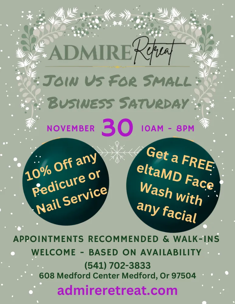 Join us on Saturday, November 30, as we celebrate small local businesses! Admire Retreat is offering exclusive one-day specials to treat yourself while supporting the community:
